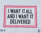 Declare your desires with this hilariously honest needlepoint canvas by Morgan Julia Designs! Featuring the cheeky saying "I Want It All and I Want It Delivered," this witty design is perfect for anyone with a bold sense of humor and unapologetic ambition.